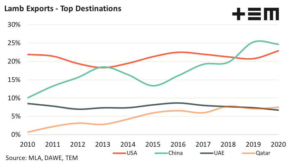The import subsidy program saw Qatar’s market share of total Australian lamb exports grow from 4.3% in 2014 to 7.5% this season. Relatively strong volumes of Aussie lamb exports during 2020 has seen Qatar move in to the third top destination for Australian lamb, behind China and the USA, at 24.7% and 22.9% – respectively.
