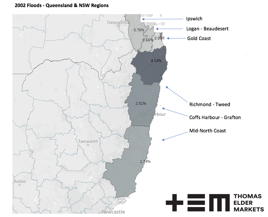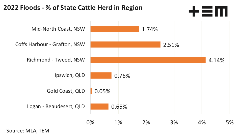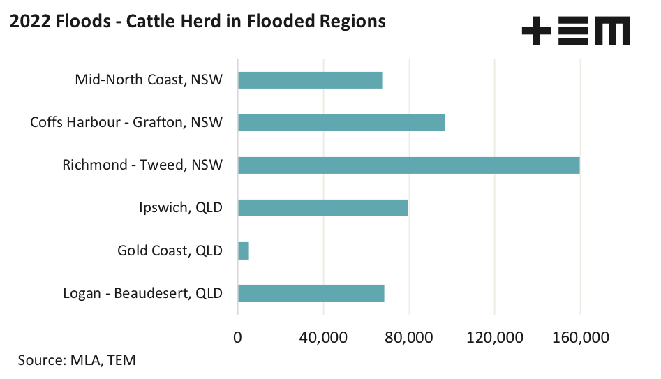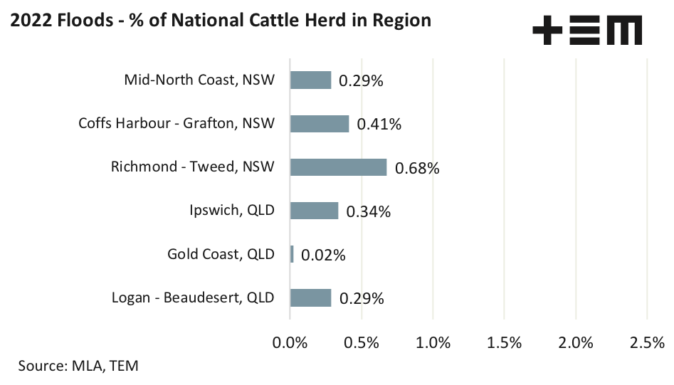 The Richmond – Tweed region in NSW holds the most cattle at around 160,000 head, which represents about 4% of the cattle herd in NSW. Combined, the three flood impacted regions within NSW account for about 8% of the states herd. In Queensland, Ipswich and the Logan-Beaudesert regions hold the majority of flood effected cattle with the herd estimated at 80,000 and 68,000 head, respectively. Combined, the three flood impacted regions in Queensland account for about 1.5% of the states cattle herd.