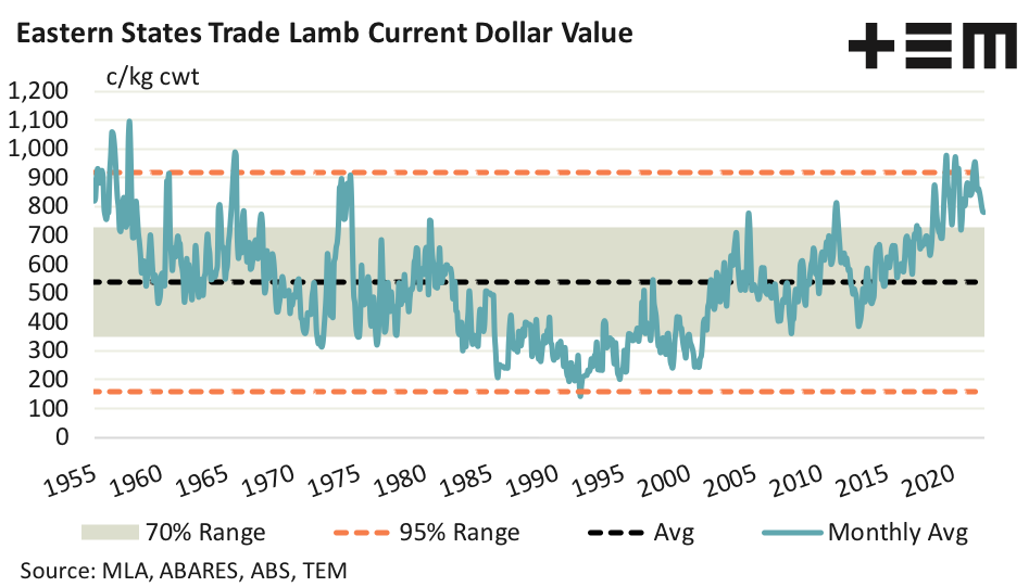The recent peak in deflated terms for the ESTLI was in July 2019 at 977c/kg cwt (in 2022 dollar values), but you would have to go back to August 1957 to have witnessed the all time deflated peak, when the ESTLI hit 1097c/kg cwt in current dollar values. At present the ESTLI is sitting at 775c/kg cwt, nearly 21 % lower than the recent peak and 29% under the 1957 record.