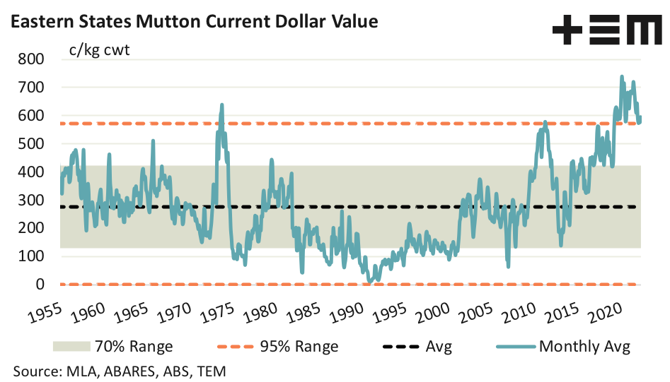The all time inflation adjusted peak for East Coast Mutton occurred much more recently. Indeed, on a deflated basis, it was in March 2020 when the mutton indicator hit 738c/kg cwt in 2022 dollar values. Currently the East Coast Mutton indicator is 590c/kg cwt, which is outside of the extreme range. Historic deflated mutton price movements above 572c/kg cwt have only occurred 5% of the time, since 1955.