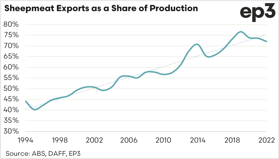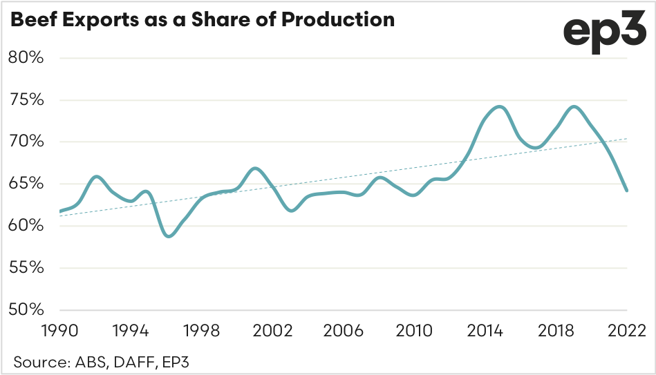 Growth in the proportion of beef exports to production has been relatively gradual over the last four decades, as demonstrated by the gradient of the trend line (dotted line on chart) from about 62% in the early 1990s to 70% in recent years. In contrast, the rise in the export focus of the Australian sheep meat sector has been much more robust, increasing from around 40% of production being exported in the mi 1990s to around 75% of production being exported in recent years.