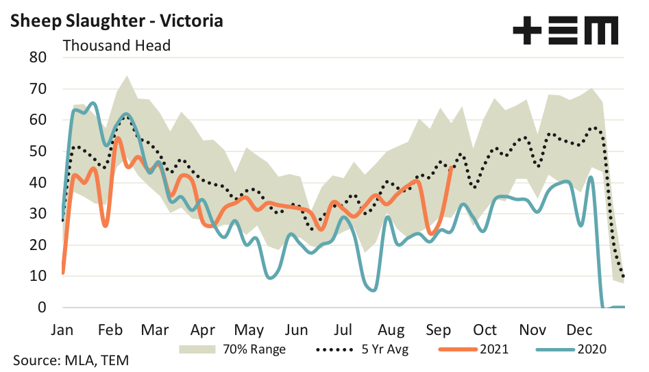 After two weeks of sheep slaughter volumes running 41% under the normal seasonal average trend Victorian sheep processing levels lifted to return to volumes consistent with the normal seasonal pattern. Weekly sheep slaughter volumes for the week ending 10th September recorded 44,644 sheep processed, nearly 2% above the five-year average pattern for this week in the season.