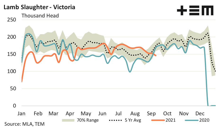 The enforcement of Covid-19 workforce restrictions on metropolitan Melbourne abattoirs appearing to limit kill space in late August/early September, with sheep making way for lambs. However, the pattern seems to have reversed with Victorian lamb slaughter now falling below the seasonal trend.