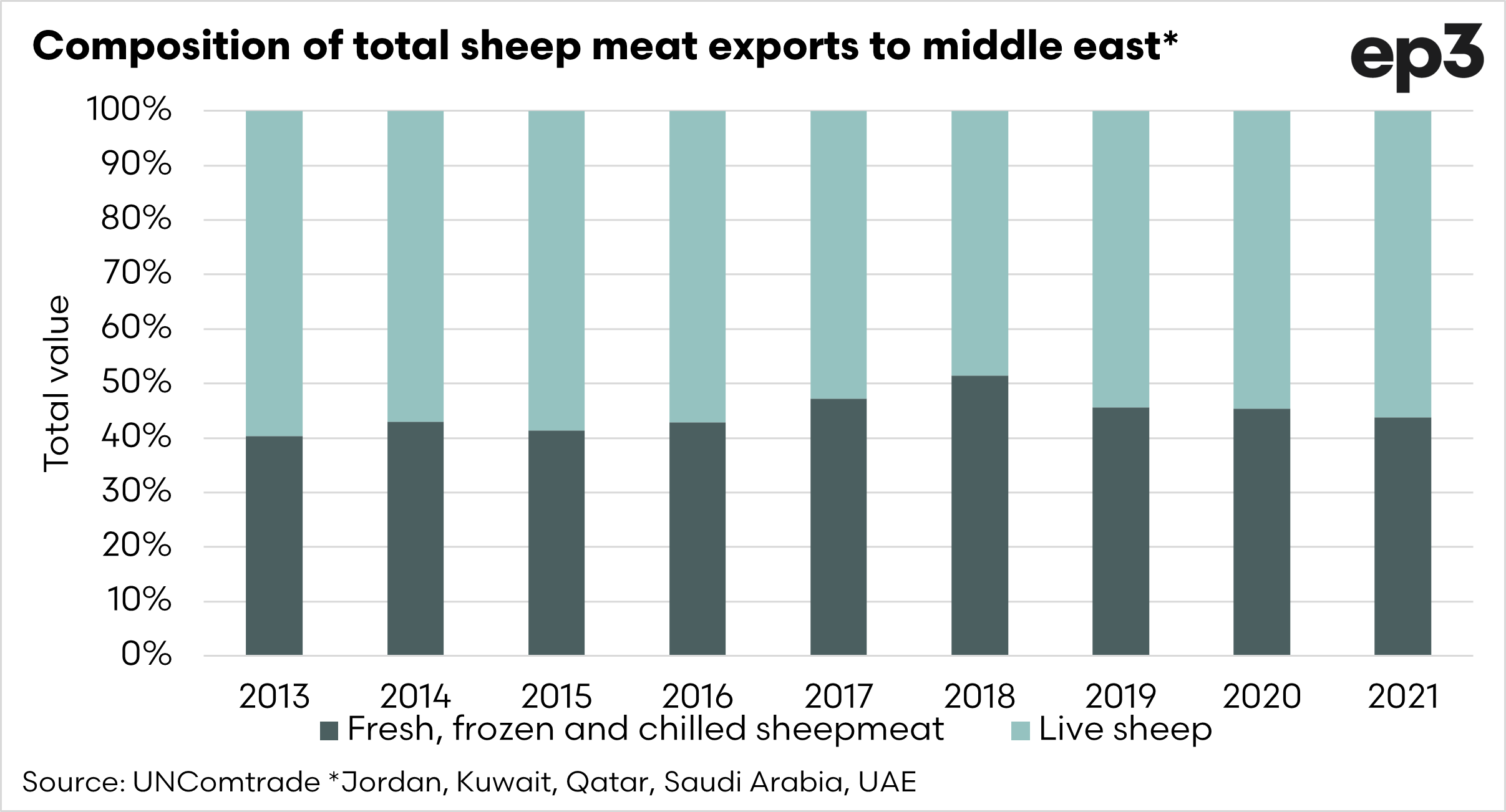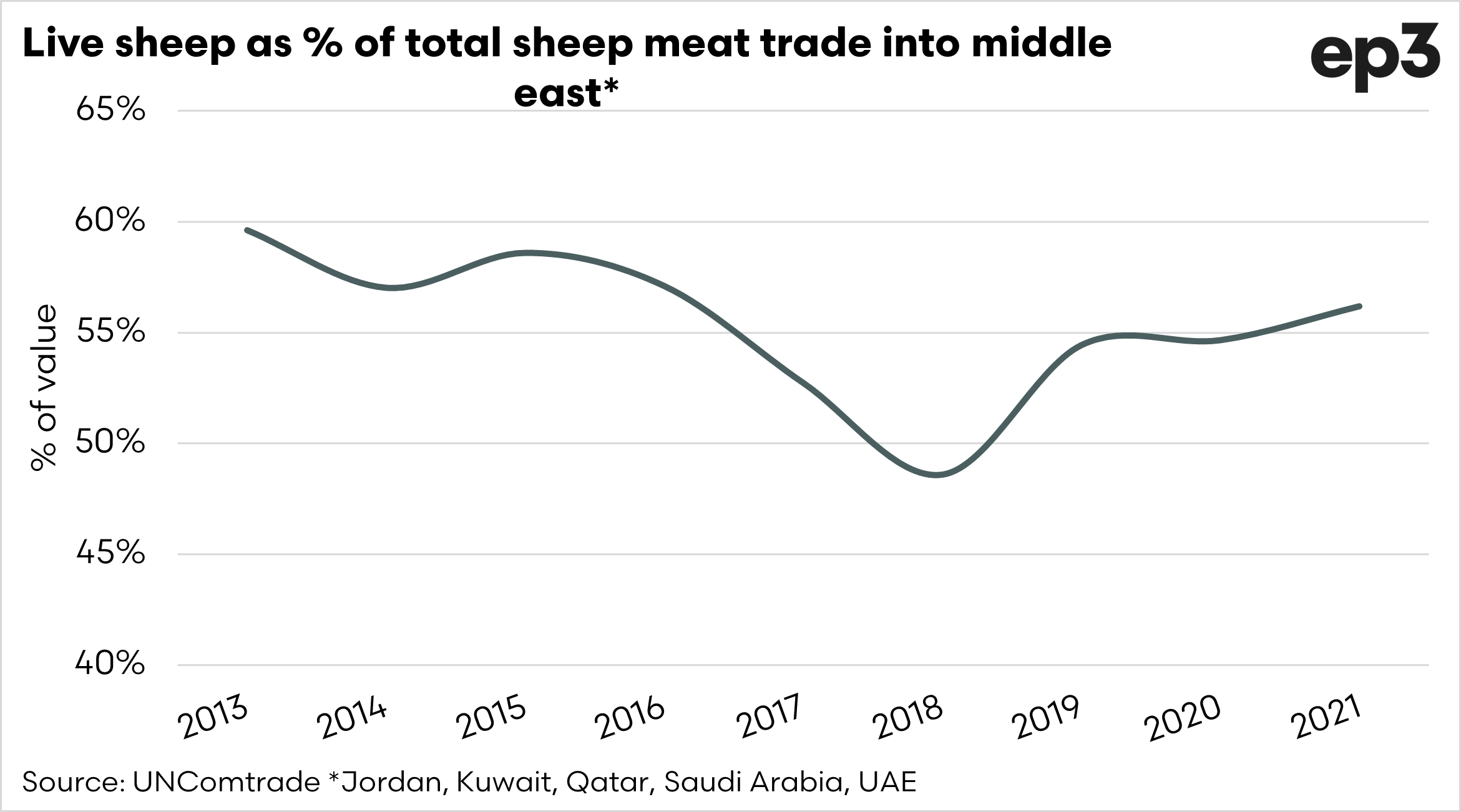 This can be seen in the second chart. Over the period, sheep live exports to these combined nations have been 55% of trade (by value).