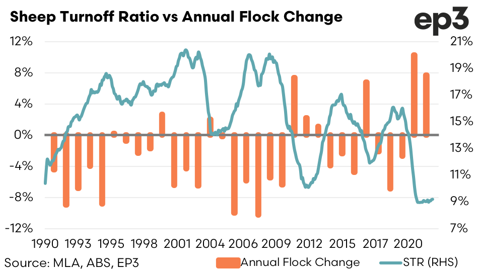 An annual average STR of 9.1% suggests an increase to the Australian flock during 2022 of around 8% based onĀ the scatter plot line of best fit, which is consistent with the 7.7% gain in the flock that Meat & Livestock Australia are forecasting this year.