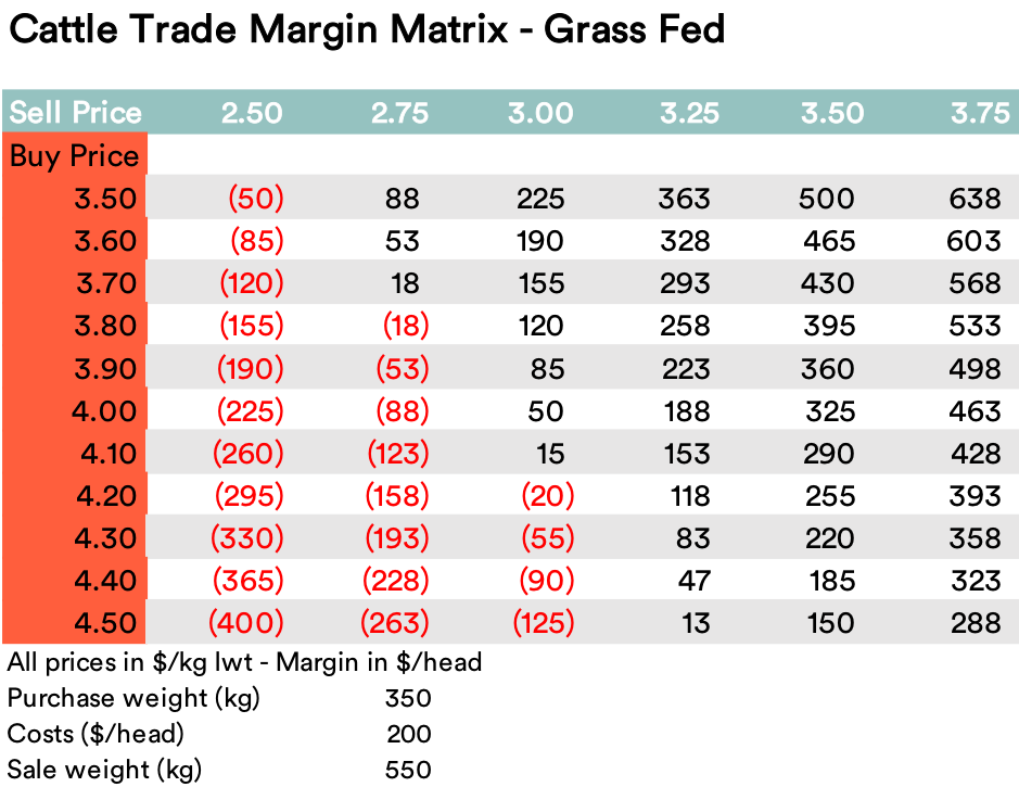 Finished steer prices have remained firm and the national heavy steer is sitting at 375c/kg lwt as at close of trade on August 19. The grass fed cattle trade matrix below shows that there is good margin in buying young cattle, even as high as 450 c/kg lwt (circa 835c/kg cwt) while the heavy steer price can stay above 350c/kg lwt.