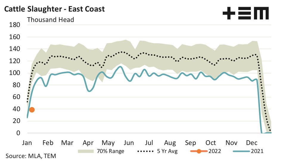 East coast cattle slaughter has began 2022 at 39,068 head, which is 60% under the levels seen for the same week in January based on the last five seasons.