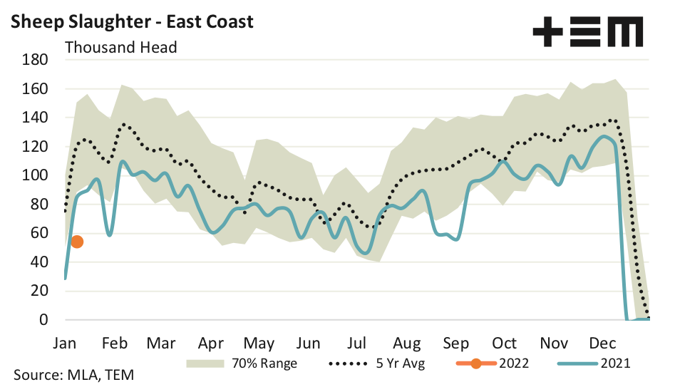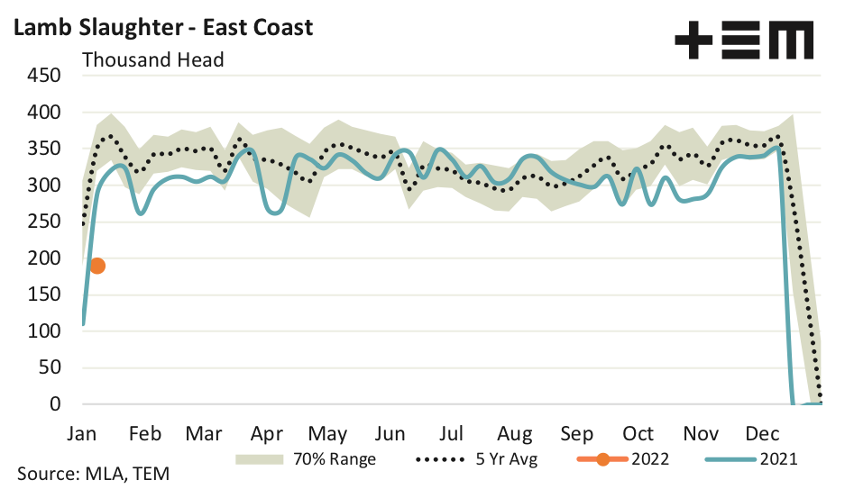 East coast lamb slaughter has opened at 189,621 head, 46% below the five-year average for this time in the season. Meanwhile, weekly east coast sheep slaughter is sitting 54% under the average seasonal trend for this week in the year, at just 54,503 head for the week ending on 8th of January.