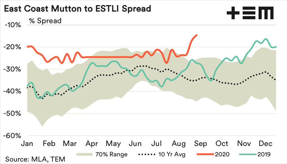 The Eastern States Mutton Indicator lifted 47c last week to hit 576c/kg cwt and saw the spread to the ESTLI narrow to just a 14.7% discount. This is the narrowest this spread discount has been all season. Indeed, it hasn’t been this narrow since the very wet 2010/2011 seasons.