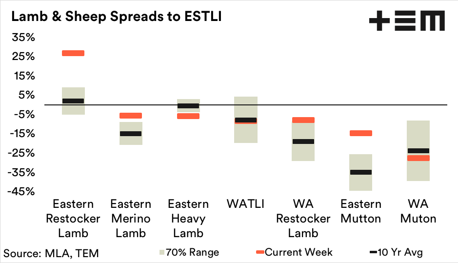 A look at the price spread to the Eastern States Trade Lamb Indicator (ESTLI) shows just how aggressive the appetite is for restocker lambs across the east coast with the spread sitting well above the average level expected for this time in the season, and significantly above the normal range, at a 26.8% premium.