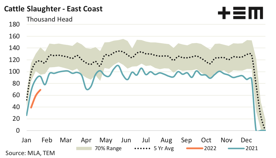 East coast red meat processors are slowly getting on top of their Covid-19 impacted workforce as weekly slaughter volumes continue to lift, but compared to January 2021 and the five-year average weekly volumes for January the kill numbers remain well off the pace.