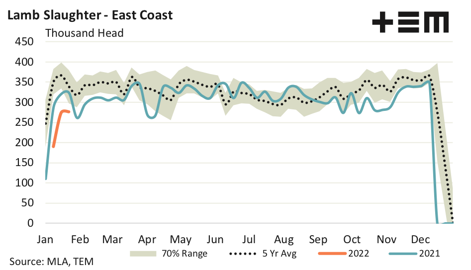 A comparison to the January 2021 season highlights the very slow start to east coast red meat processing with cattle volumes 32% under last season. East coast sheep processing is running 31% below the January 2021 weekly average levels, meanwhile east coast lamb is sitting 21% under the January 2021 levels.