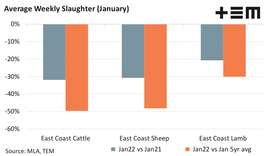 Comparing the three slaughter categories to the average weekly volumes seen over the last five seasons during January has east coast cattle slaughter 50% below trend, east coast sheep is 48% under trend and east coast lamb is 30% lower than the seasonal five-year average levels.