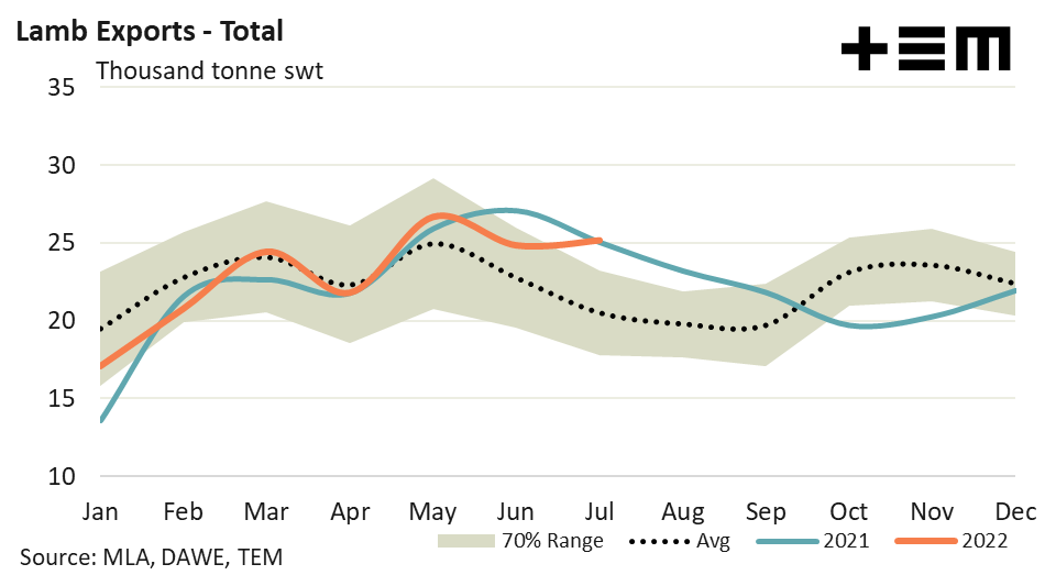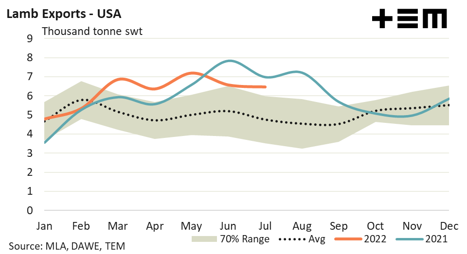 Australia’s number one destination for lamb exports, the USA, holds steady over July 2022 with just a 1% decline from June volumes to 6,474 tonnes swt. Lamb exports to the USA are 7% below the flows seen in July 2021, but compared to the five-year avearge for July current volumes are 36% higher than the seasonal average pattern.