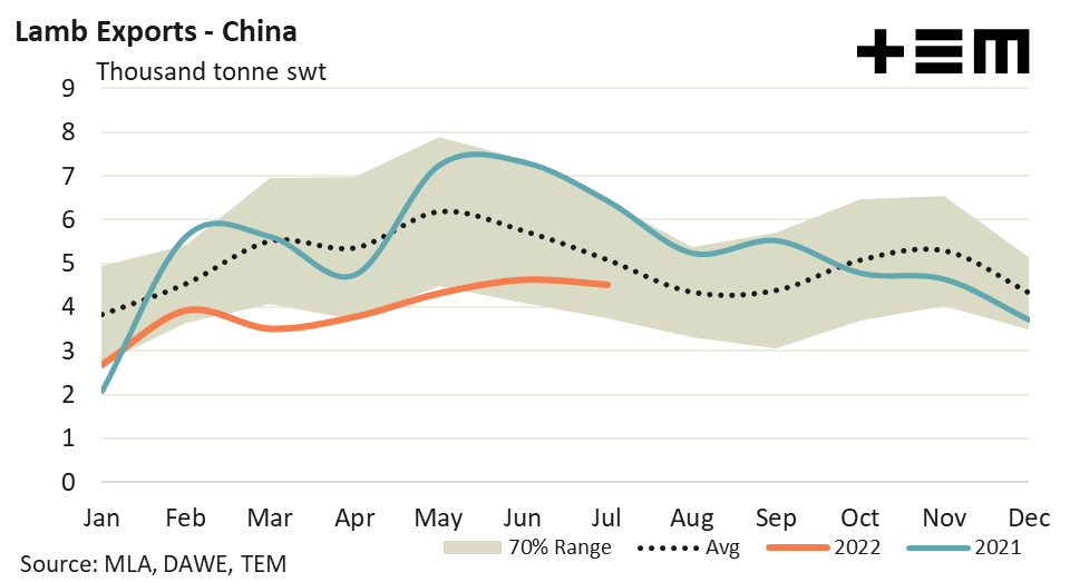 Aussie lamb export flows to China saw a 2% dip from June to July with 4,506 tonnes swt consigned. Compared to the 2021 season July trade of lamb from Australia to China is nearly 30% below the volumes seen at this time last year. The picture isn’t as dire when compared to the five-year average for July, coming in at 11% under the seasonal average trend.