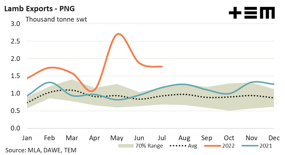 PNG have moved into third top destination for Australian lamb exports in 2022. July trade levels remain strong, albeit exhibiting a sideways trend from June levels. There was 1,767 tonnes swt of Aussie lamb exported to PNG in July, 5% below the June volumes. Compared to July 2021 the current export levels are 51% higher and the comparison to the five-year average for July is even more impressive, coming in nearly 90% above the average pattern.