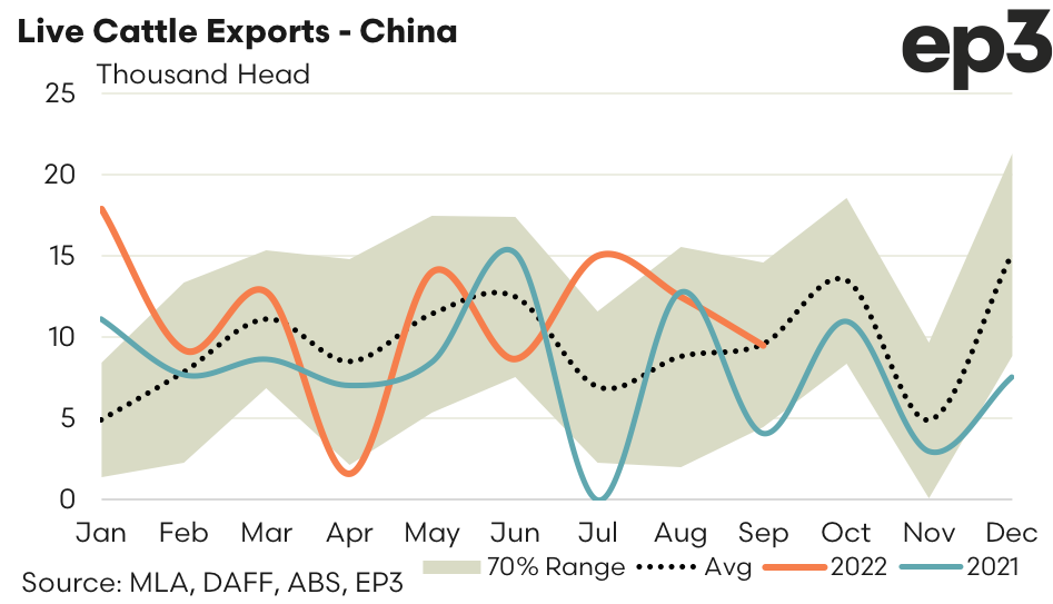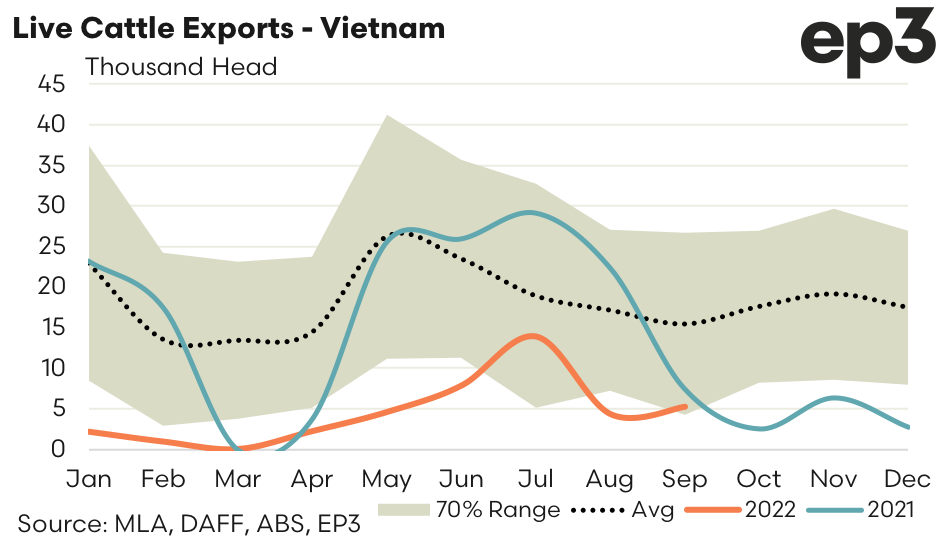 After showing signs of improvement in July the trade to Vietnam has returned to levels consistent with the lower end of the normal range, with September reporting 5,210 head of cattle exported. So far across 2022 average monthly flows to Vietnam have been running 75% under the five-year average pattern, with high Australian cattle prices and stiff competition from South America encouraging the Vietnamese buyer to look elsewhere.