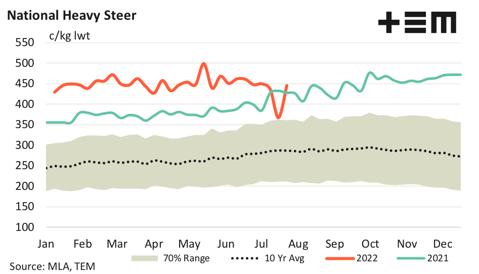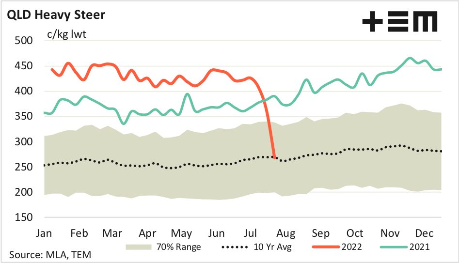 Meat and Livestock Australia’s (MLA) saleyard reporting provided a surprise in Queensland’s heavy steer pricing with the NLRS reported indicator sliding 93 cents on the week to 268 c/kg lwt. A fortnight ago it was reported at 407 c/kg lwt, so it appears to be a rather dramatic crash. However, further investigation of the price movement shows that the uncharacteristic price crash was due to very low numbers reported for the Heavy Steer category.