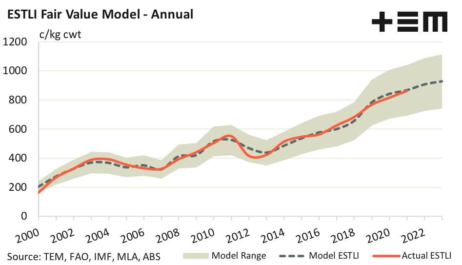 The good news for Aussie lamb producers doesn’t stop in 2022 with the model suggesting annual average fair value for the ESTLI in 2023 at 927c/kg cwt. This puts the prospect of a peak in the ESTLI during the winter of 2023 above 1100c/kg cwt and a seasonal low nearer to 750c/kg.