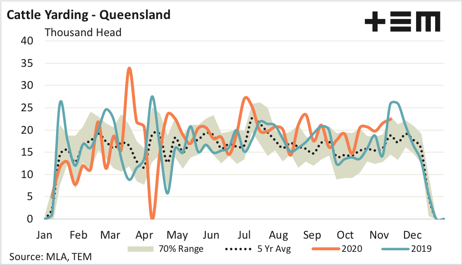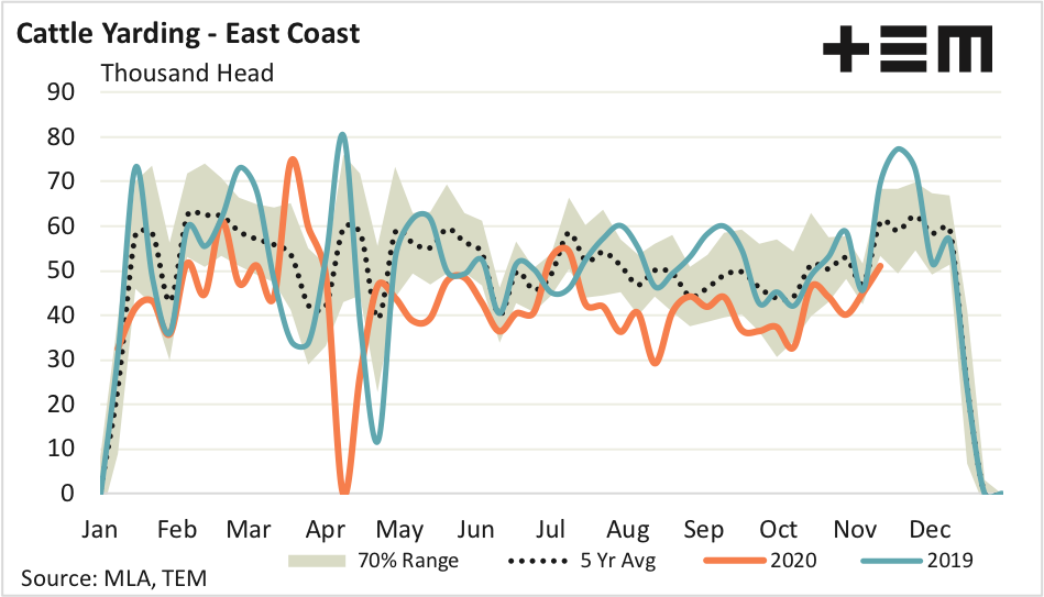 East coast weekly cattle yarding levels have risen 55% from their October lull to see 51,125 head presented last week. Despite the increased cattle numbers at the sale yard the seasonal trend has remained tight with average weekly yarding levels running nearly 17% below the average five-year pattern for the 2020 season.