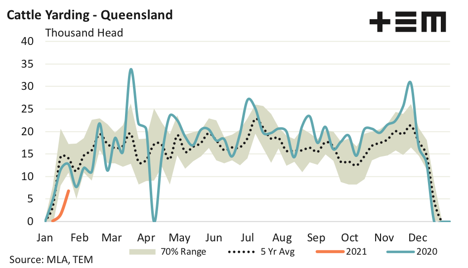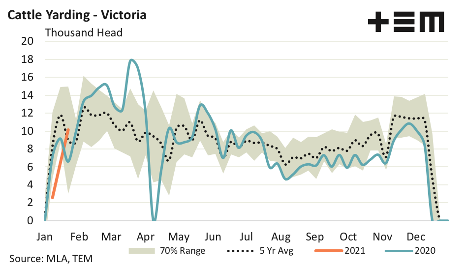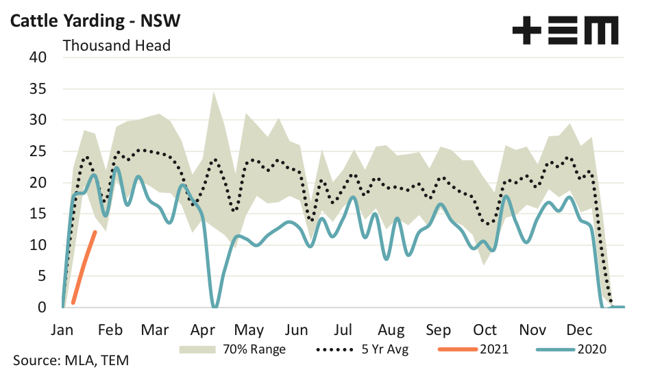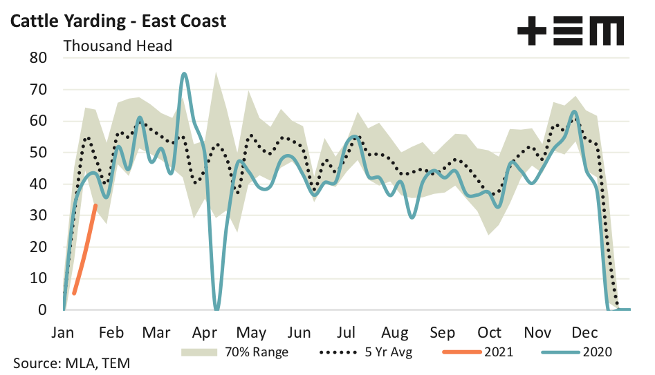 East coast cattle yarding levels are running well below trend. Since the start of 2021 average weekly yardings are 44% below the five-year pattern. Last week saw throughput levels increase from 17,874 to 33,241 head as sale yard operations began to normalise from the festive season break. However, this still represents volumes that are 30% below the five-year average seasonal pattern for this week in the year.