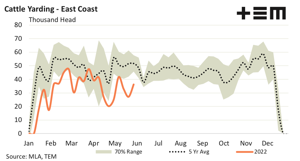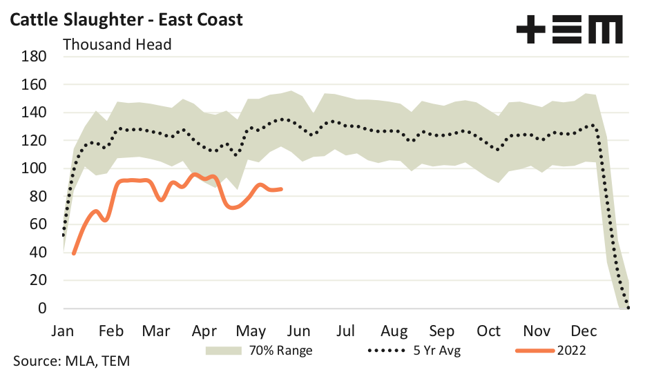 MLA reported weekly east coast cattle yarding levels have spent much of 2022 below the five-year average pattern, with only one week spent above the average in late March. So far this season east coast yarding levels are running nearly 30% under the five-year trend. It is a similar story of tight supply for weekly slaughter volumes. MLA reported east coast cattle slaughter has spent nearly all of the 2022 season under the lower end of the normal range in weekly slaughter, as identified by the grey shaded 70% range. Compared to the five-year average pattern for slaughter the current trend for 2022 has been running 33% below the average pattern.
