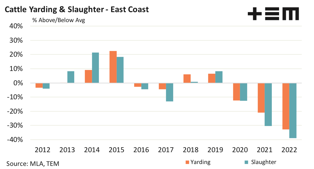 Taking a look back at the last decade of slaughter and yarding reporting, comparing each season’s volumes to the ten-year average we can see that the last two years have been the tightest situation experienced. In 2021 east coast cattle yarding ran 21% below the ten-year average trend and slaughter was 30% under the average. So far in 2022 the situation has tightened further compared to the ten-year average with yarding levels 33% below and slaughter 39% under the average pattern.