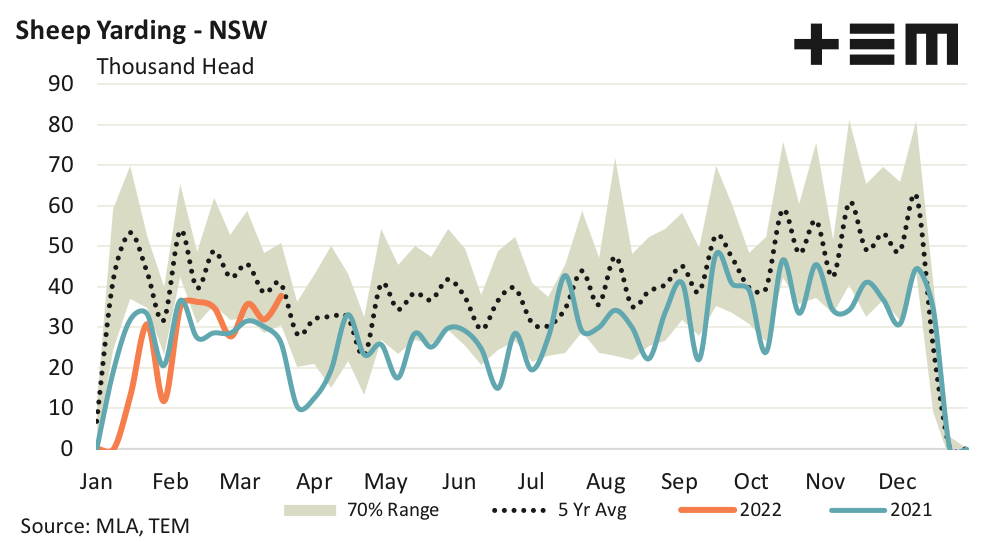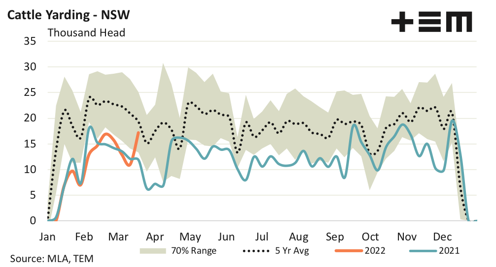 Cattle have come back to the saleyards too in NSW, with weekly volumes lifting 56% on week prior. This is the highest weekly yarding levels in NSW so far this year, and just 11% under the five-year average pattern for this week in the season (ending March 18th). There were 17,133 head of cattle presented at NSW saleyards last week, according to MLA’s NLRS data.