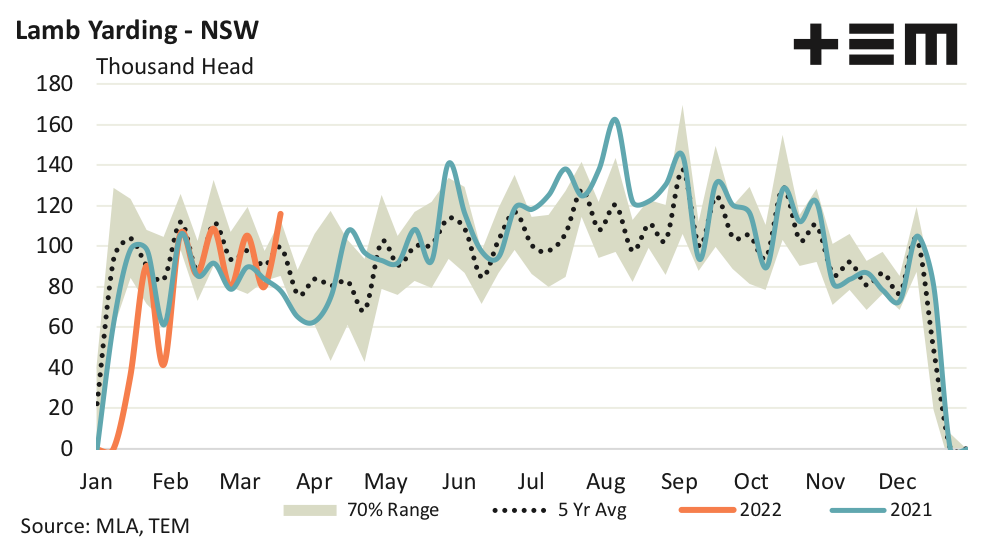 Strong lift in weekly lamb yarding in NSW last week, with numbers up 45% on the previous week to 116,180 head. Current saleyard volumes are trekking 17% ahead of the five-year average trend for this week in the season.