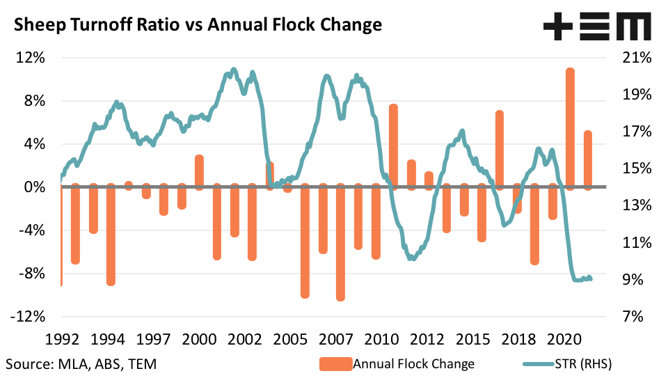 The release of the Australian Bureau of Statistics sheep slaughter data for the March 2022 quarter provides an opportunity to measure the strength of the flock rebuild underway currently. The sheep turnoff ratio (STR) is a useful signal to show if the national flock is in rebuild or liquidation phase. Historically, when the STR is above 14% we aren’t holding onto enough sheep in order to allow a rebuild and the flock goes into decline. Similarly, once we are below 14% for the STR then the flock has the capacity to rebuild.