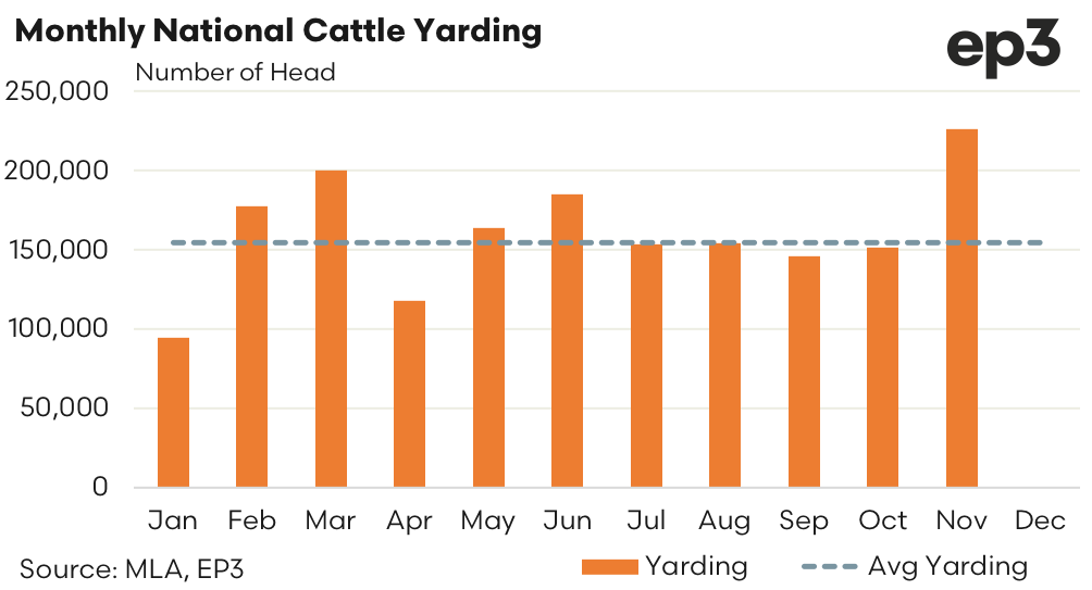 A look a the national yarding volumes for November give a bit of a clue to the price pressures being seen over the last four weeks. National cattle yardings are up to the highest monthly level seen all year at 226,514 head, which is a 49% lift on the volumes seen in October and 47% above the average monthly yardings seen over the 2022 season.