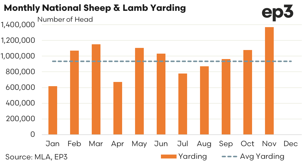 Combined sheep and lamb yarding levels paint a similar picture with November yarding levels up 27% from the volumes seen in October. November 2022 saw 1.37 million head of sheep and lamb presented at saleyards across the country, the highest monthly yarding of sheep and lamb seen all year and levels that are 47% above the average monthly yarding seen so far this season.