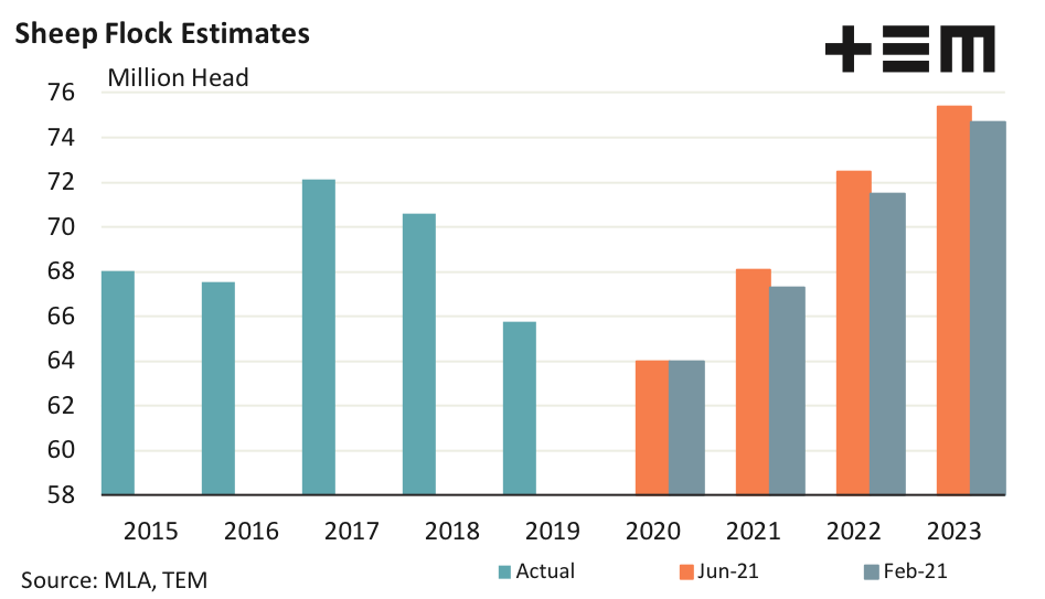 Further seasons see the flock growing at a faster pace than previously outlined too. The 2022 season is forecast to see the flock reach 72.5 million head, compared to the 71.5 million announced earlier in the year. This is an upwards revision of 1.3%. The flock is now expected to hit an eight year high during 2023 of 75.4 million head after MLA increased their projections by 0.9%.