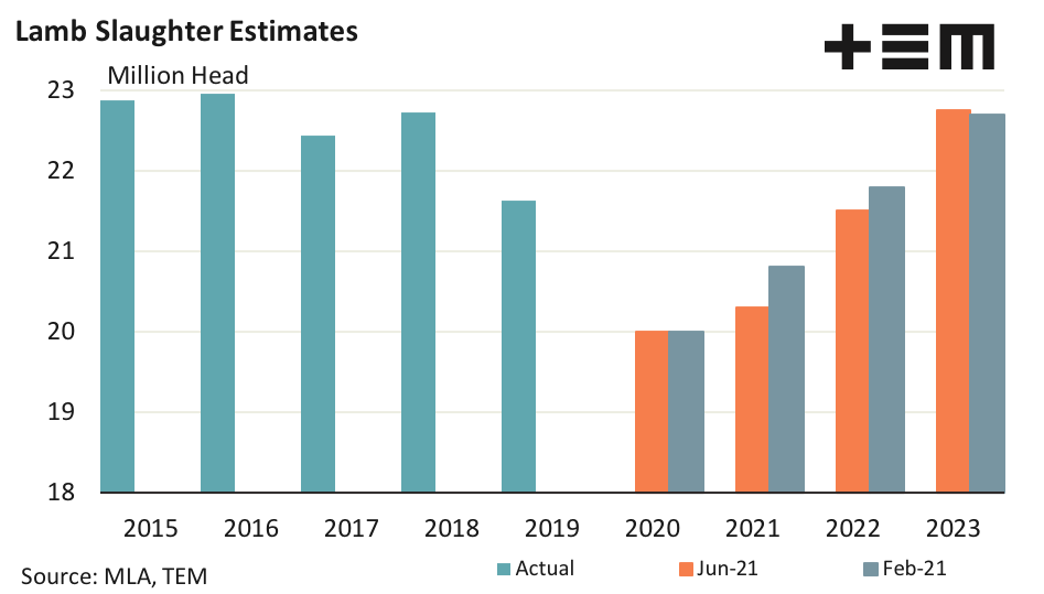 Under-pining the quicker pace of the flock rebuild is lower slaughter estimates for the 2021 and 2022 seasons. MLA now predict that lamb slaughter in 2021 will be nearly 3% softer than forecast in their February update with the June outlook estimating a slaughter level of 20.3 million head, down from 20.8 million head.