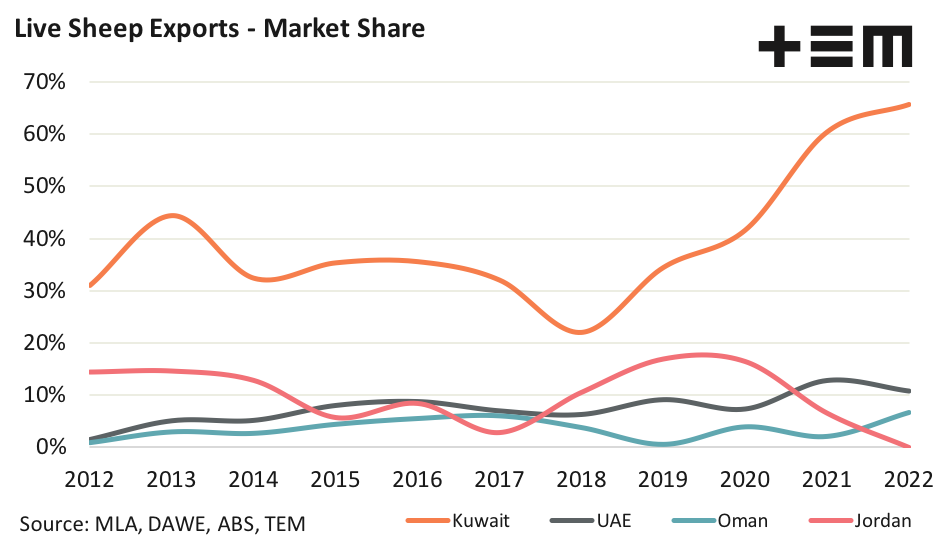 Kuwait has been the dominant destination market for Australian live sheep exports, with their market share of the trade growing steadily since 2018. This year Kuwait has taken 66% of the volumes exported. March 2022 saw no live sheep exports to Kuwait and total trade flows tanked, with just 9,495 head reported exported for the month.
