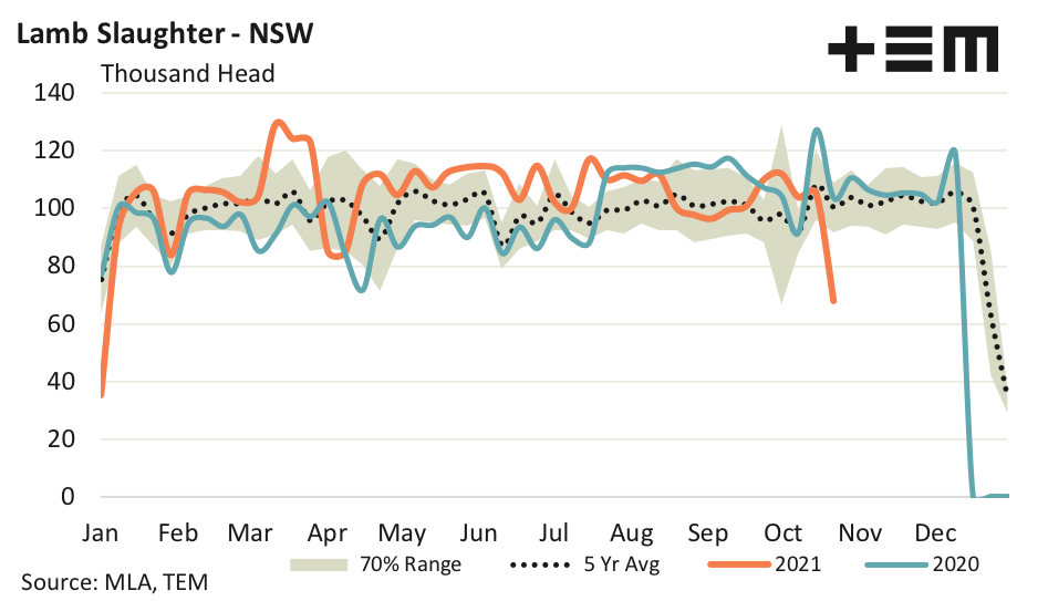 A re-check of the weekly slaughter figures was required with Meat and Livestock Australia (MLA) as the NSW lamb slaughter volumes took an uncharacteristic tumble this week. The National Livestock Reporting Service (NLRS) team at MLA confirmed that a NSW processor was down for the week ending 22 October and the result was a 36% drop in lamb slaughter volumes to see just 67,859 head processed.