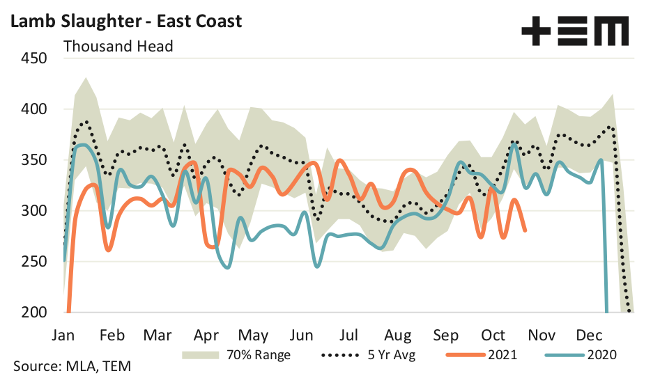 The combined east coast lamb slaughter volumes have been volatile of late, displaying a see-saw action over the past few weeks between 275,000 and 320,000 head. Usually at this time of the year east coast lamb slaughter is averaging about 350,000 head per week. The week ending 22 October saw just 280,721 head of lamb processed which places the current slaughter volumes at levels 21% under the five-year average pattern.