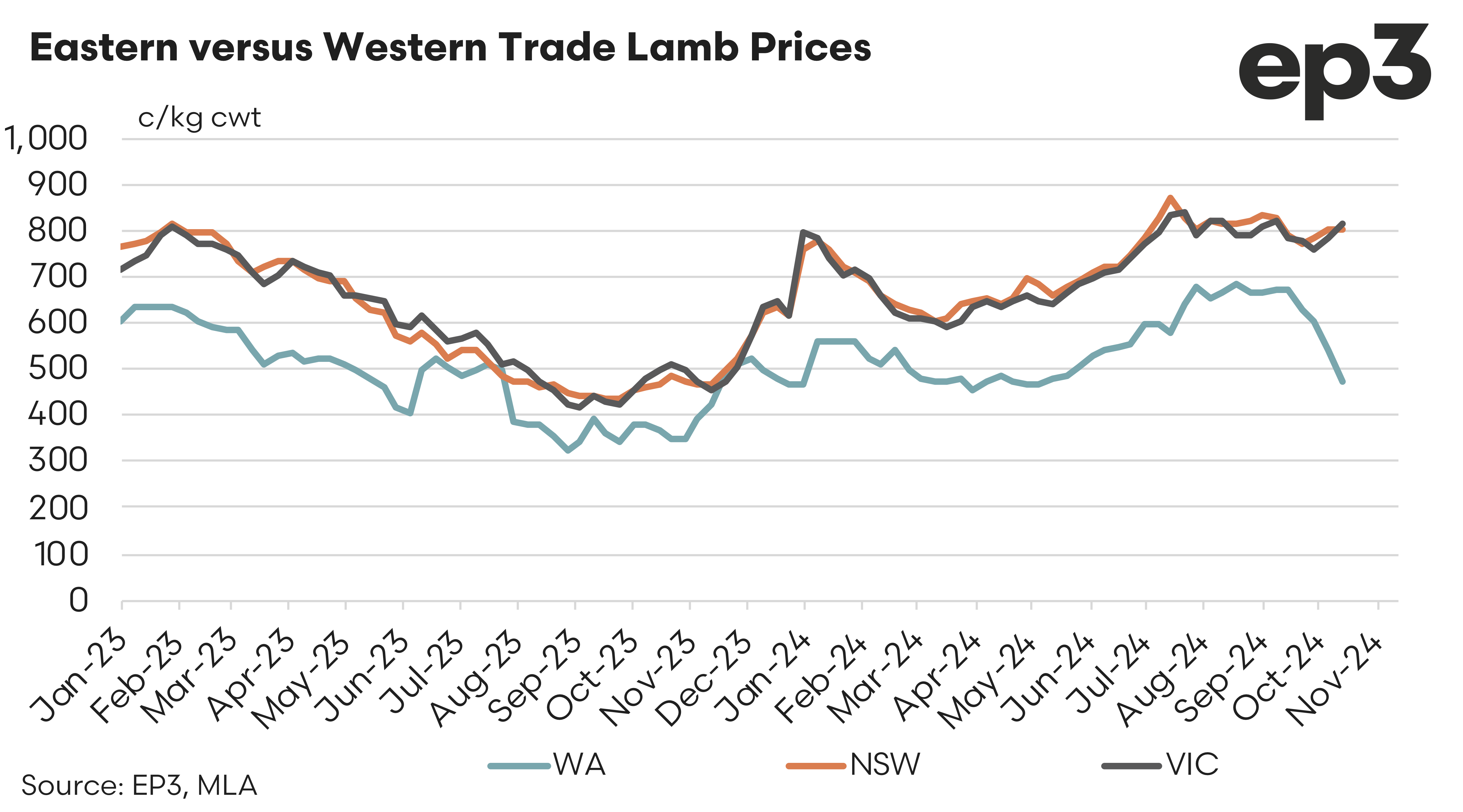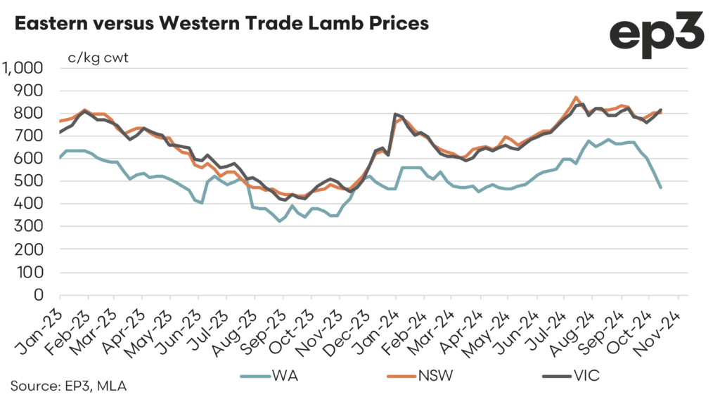Live exports provided farmers with a reliable outlet and pricing stability, shielding them from domestic price volatility. However, with the sector shrinking, farmers have become more reliant on domestic processing, which lacks the capacity to absorb the surplus, driving down prices. In mid-October, trade lambs in WA fetched 472 cents/kg, 42% lower than in the east. Mutton prices have followed a similar trend, with WA mutton priced at 162 cents/kg, 40% below the national average.