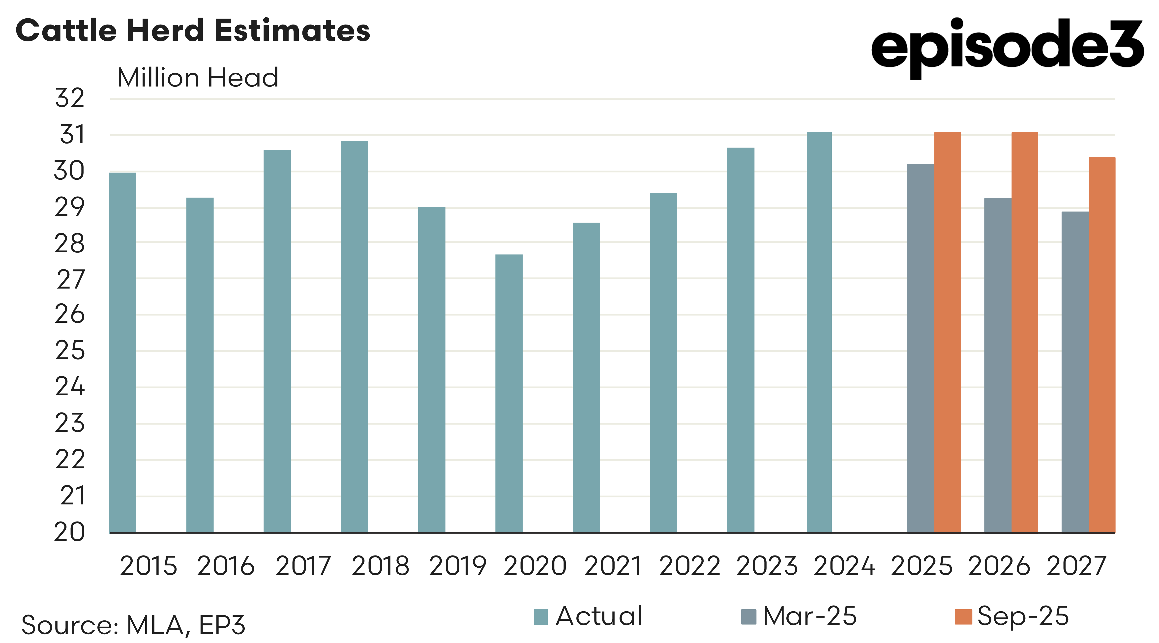 The national herd is now expected to hold at 31.0 million head in 2025 and 2026, easing slightly to 30.3 million in 2027. This compares with earlier forecasts of 30.1, 29.2 and 28.8 million respectively.