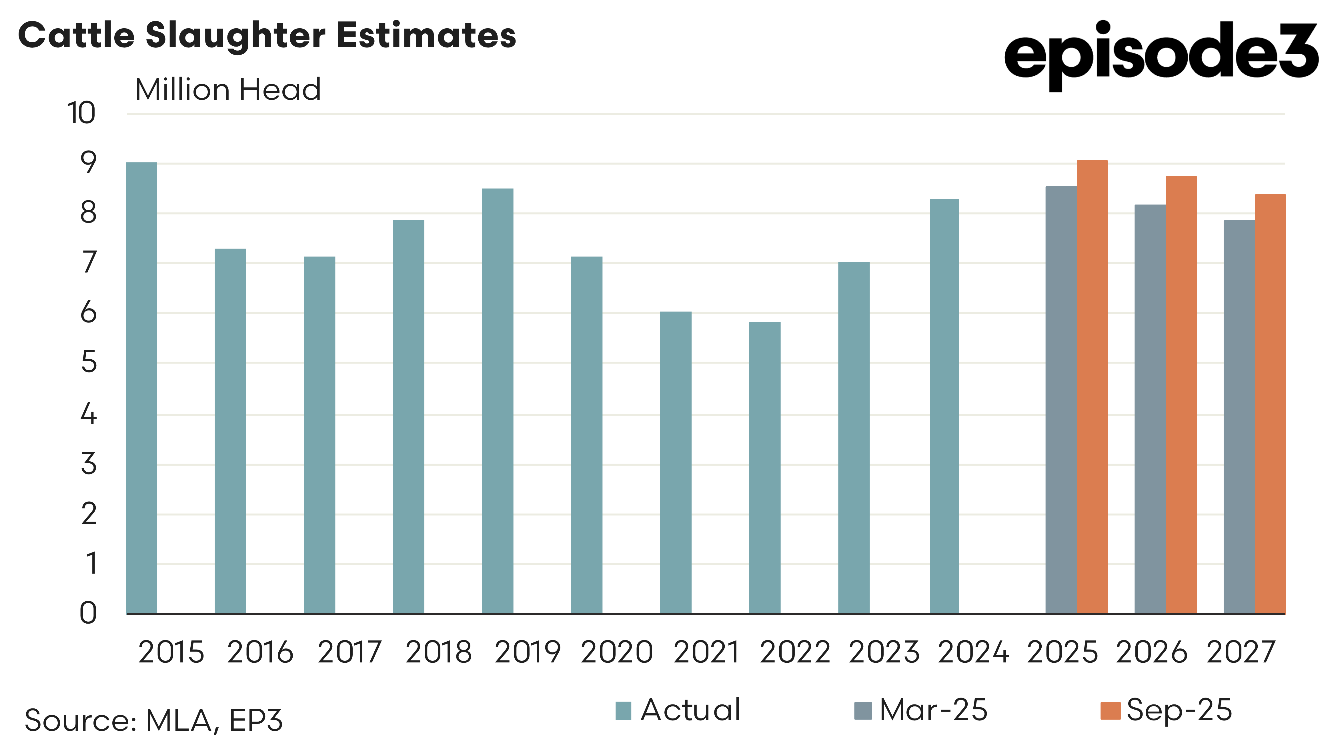 Slaughter forecasts have also been revised higher, with 9.0 million head expected in 2025, followed by 8.7 million in 2026 and 8.3 million in 2027 – up from 8.5, 8.1 and 7.9 million in the March projections. The elevated turn-off reflects a more efficient, genetically improved herd capable of sustaining high throughput without rapid liquidation