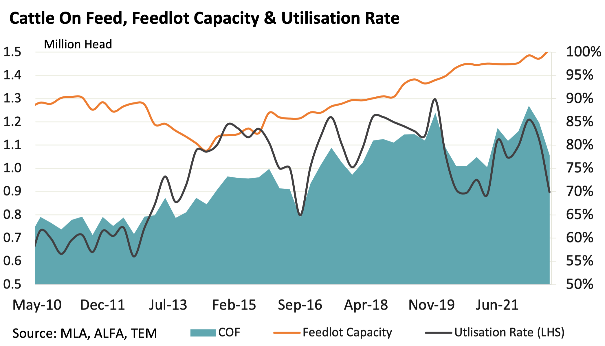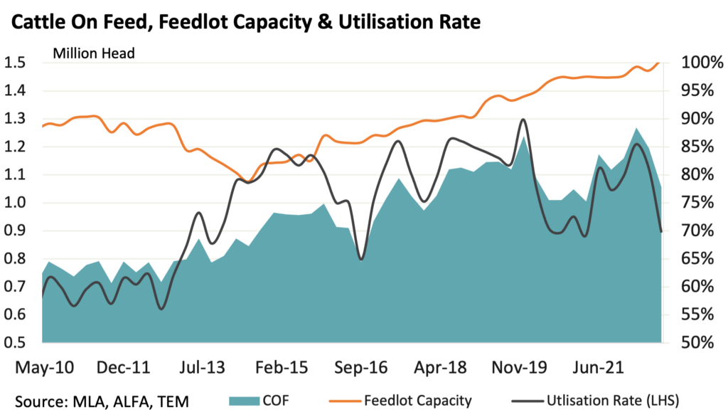 The increase to feedlot capacity, combined with the reduced cattle on feed this quarter saw capacity utilisation levels drop to 70% nationally from 81% in June. Capacity utilisation is strongest in Queensland at 76%, followed by NSW at 69%.