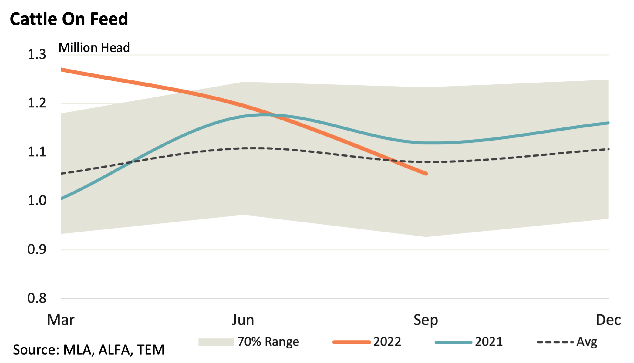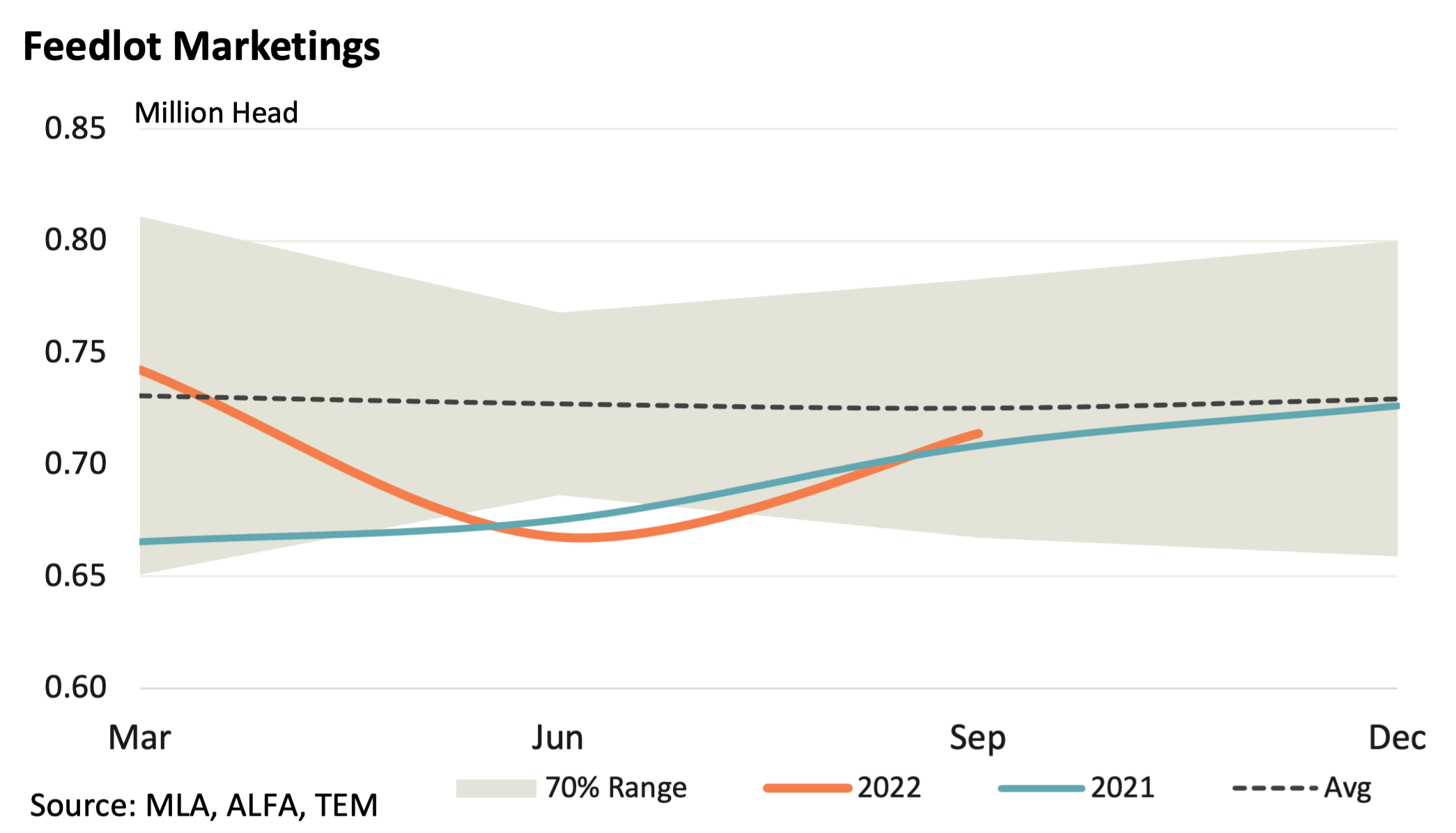 A look at the seasonal trend shows a clear downward trajectory for total cattle on feed during 2022 and quarterly volumes in the feedlot have dipped below the average seasonal trend for the first time since March quarter 2021, albeit marginally at 2% under the five-year average volumes for September.