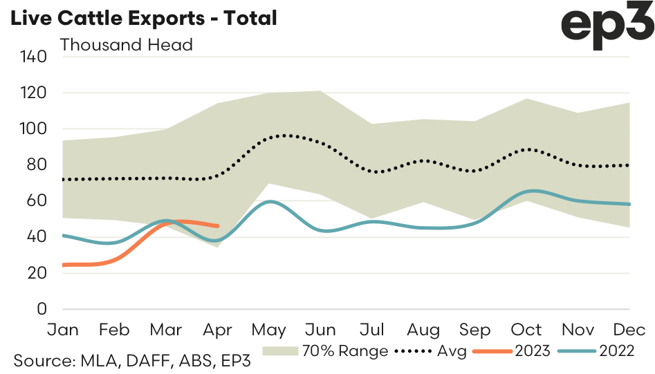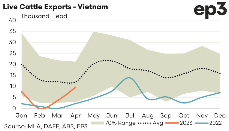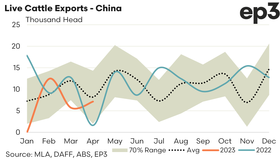 All three top destinations for Aussie live cattle exports have underwhelmed us in April with monthly volumes all running below the five-year average seasonal pattern across Indonesia, Vietnam and China. This places total live export volumes for April 2023 in a pretty lacklustre position easing by nearly 3% from levels seen in March to record just 46,006 head of cattle transported offshore.