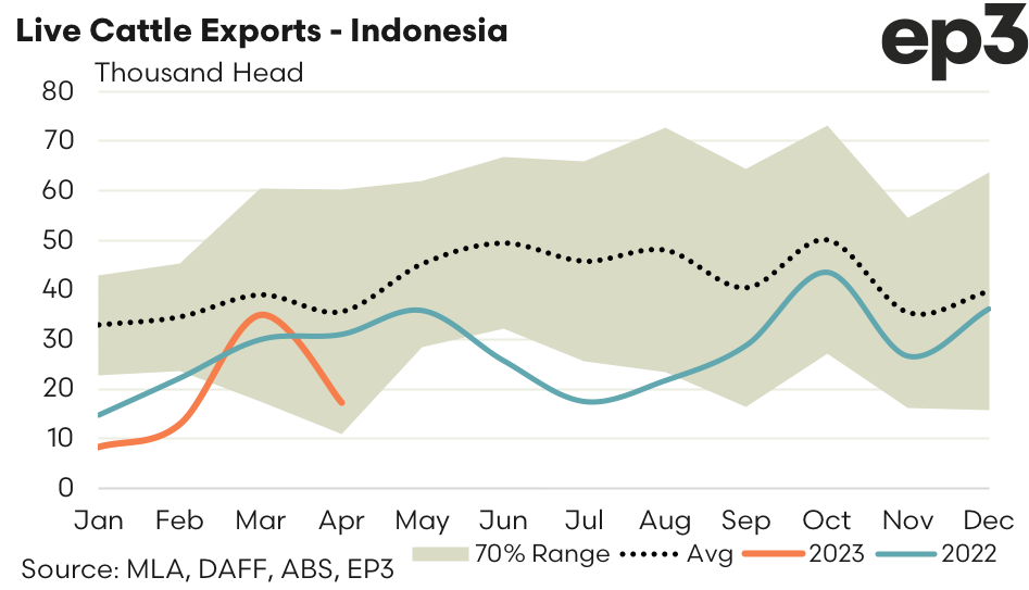 Please note – at the time of publication some live export cattle flows from Australia to Indonesia over April 2023 were not reported. These flows will be updated in a subsequent publication.