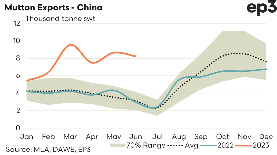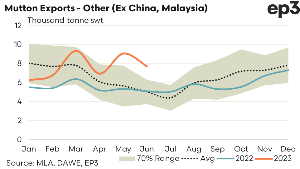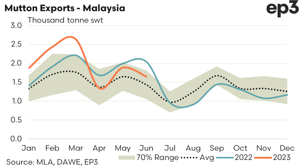 Malaysia saw a 12% decline in the trade over the month, but remains at pretty strong levels relative to the average pattern. There was 1,648 tonnes of mutton shipped to Malaysia in June which represents levels that are 15% higher than the June average, according to the last five-years of trade.