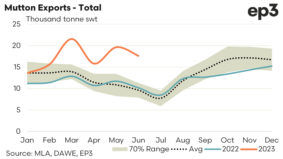 Total mutton exports for Australia over June eased 10% from the previous month, but still managed to set volumes nearly 74% above the five-year average for June with 17,757 tonnes reported shipped. Since the start of the year average monthly mutton exports are running 42% above the normal seasonal trend, indicative of some very strong offshore demand this season.