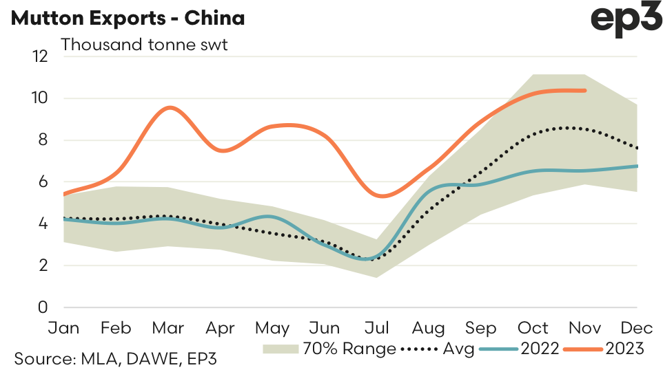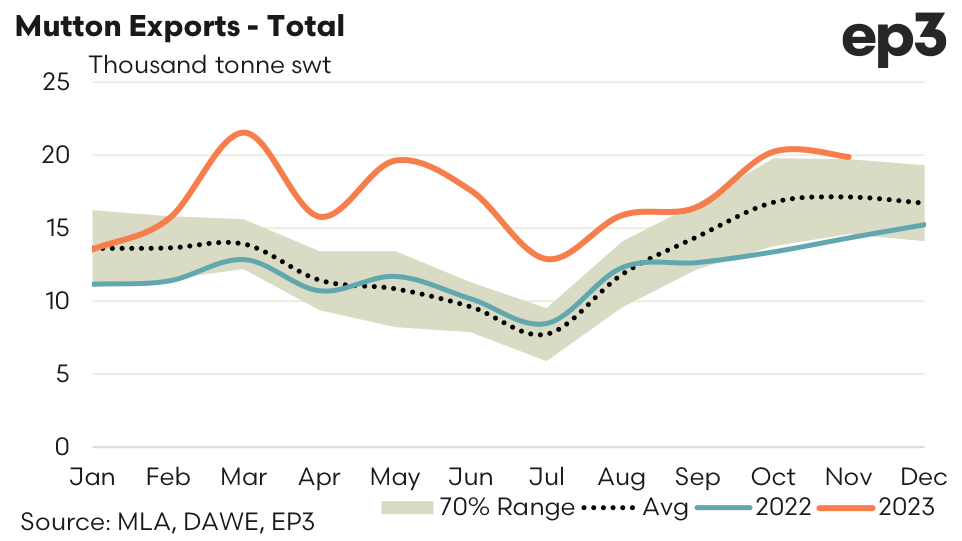 Current total mutton export volumes are nearly 39% higher than during November 2022. Indeed, it has been the best November result since 2019 and mutton export flows for this November are running nearly 14% above the five-year average level for November.