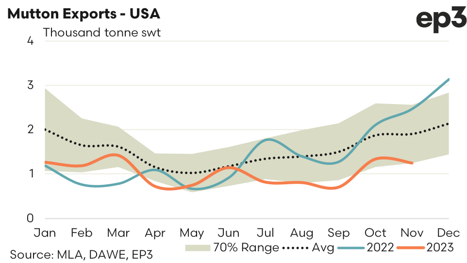 USA – Aussie mutton exports to the USA remain somewhat subdued during 2023 and November was no exception. There was 1,244 tonnes reported shipped during November 2023, a 7% easing from October and nearly 35% under the November average, based on the last five years of trade data.