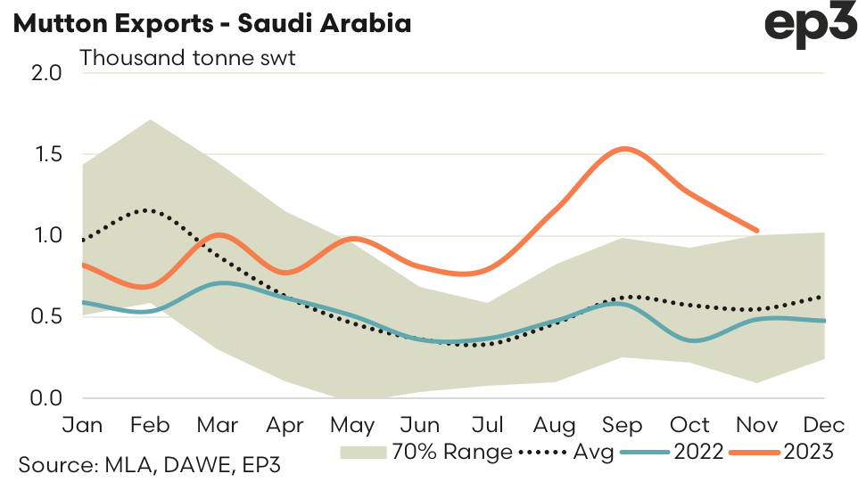 Saudi Arabia – Mutton exports from Australia to Saudi Arabia eased 18% from the levels seen over October to 1,031 tonnes swt. Despite the decline current trade volumes are still very robust sitting 112% higher than the levels exported over November 2022 and 88% above the five-year average for November.