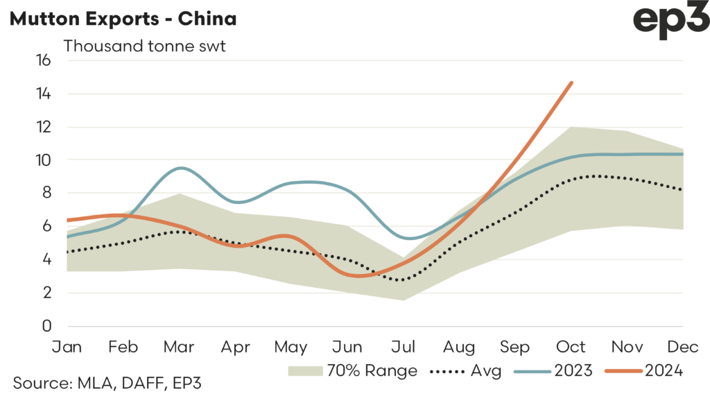 China – There was a 47% increase in Aussie mutton exports to China during October to hit 14,613 tonnes shipped, making a new record monthly volume to China. This result beats the previous record high mutton trade levels by 17%. Current October trade flows to China are sitting 43% higher than October 2023 and 65% above the five-year average monthly flows recorded for October.
